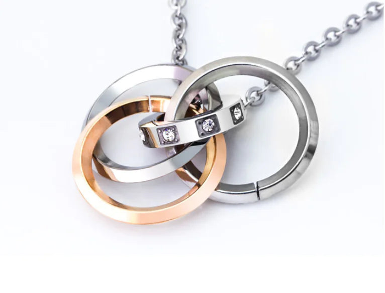 Elevate your style with our exquisite couple's necklace, crafted from titanium steel and designed to make a statement. This stunning piece features a unique three-ring diamond design that glimmers with elegance, perfect for couples who want to showcase their bond.