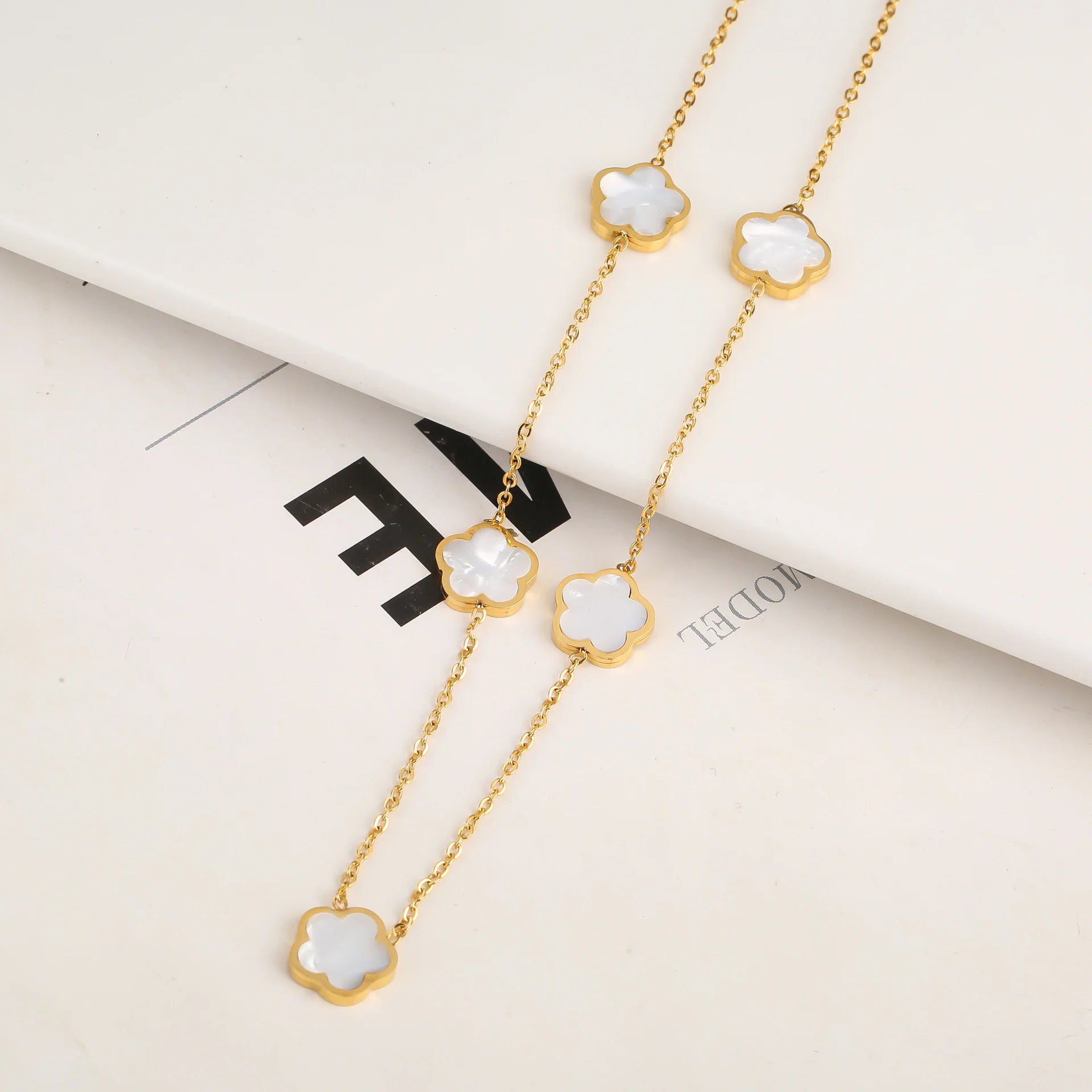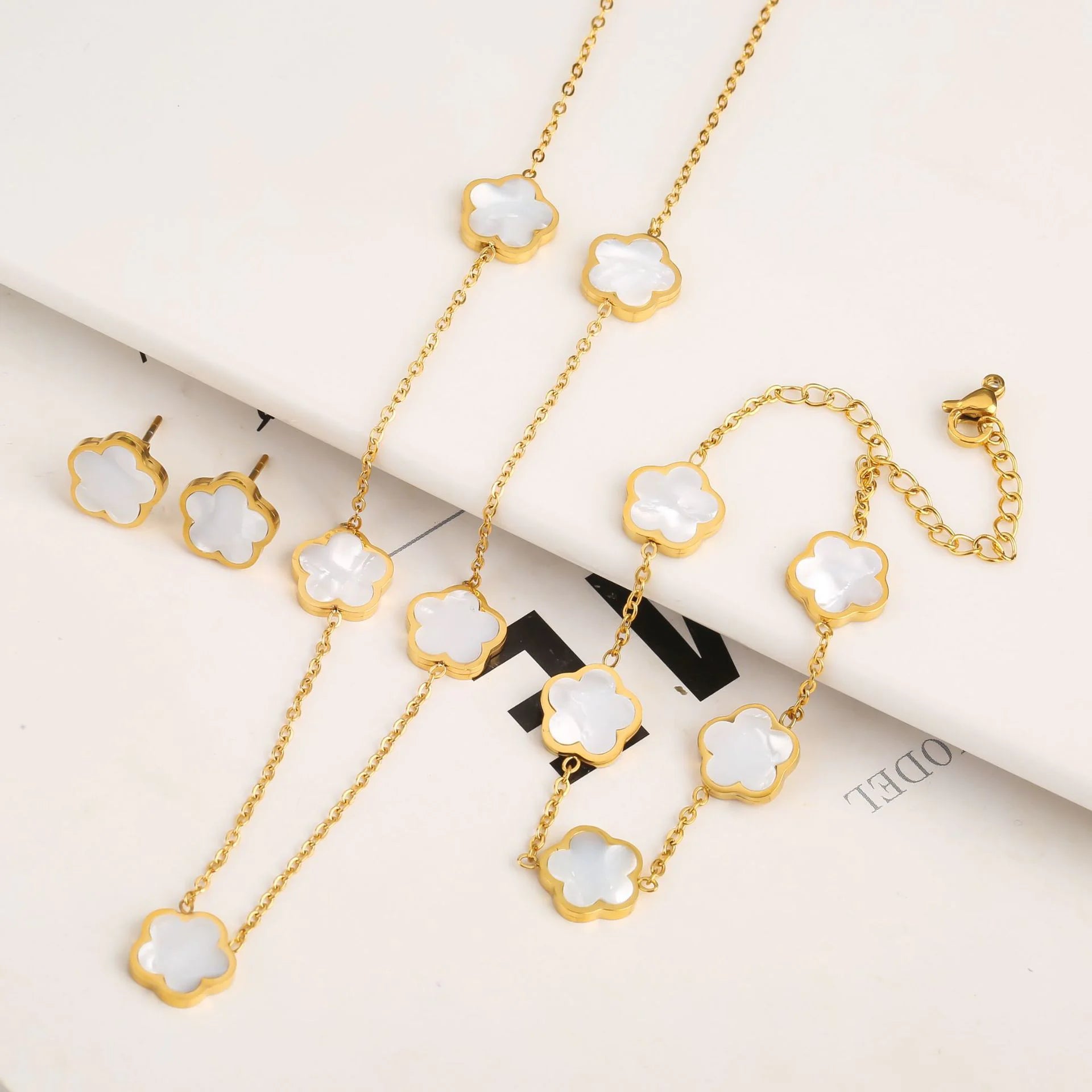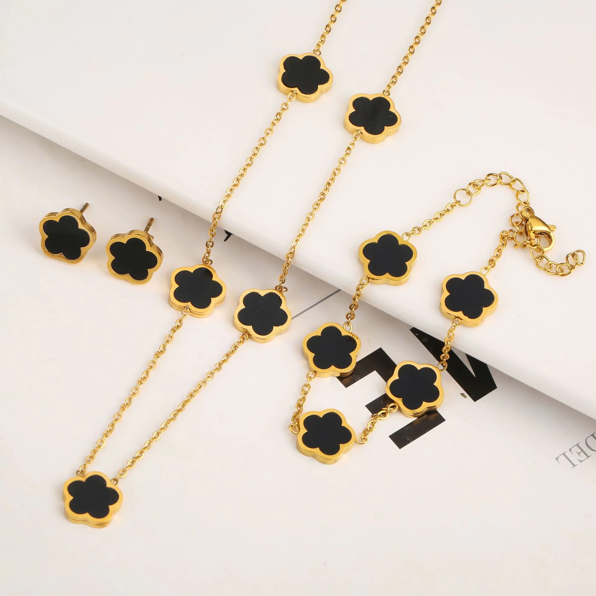 Elevate your accessory game with this elegant stainless steel jewelry set featuring a delicate fritillary five-leaf petal design. This coordinated set includes earrings, a bracelet, and a necklace—perfect for everyday elegance or special occasions.